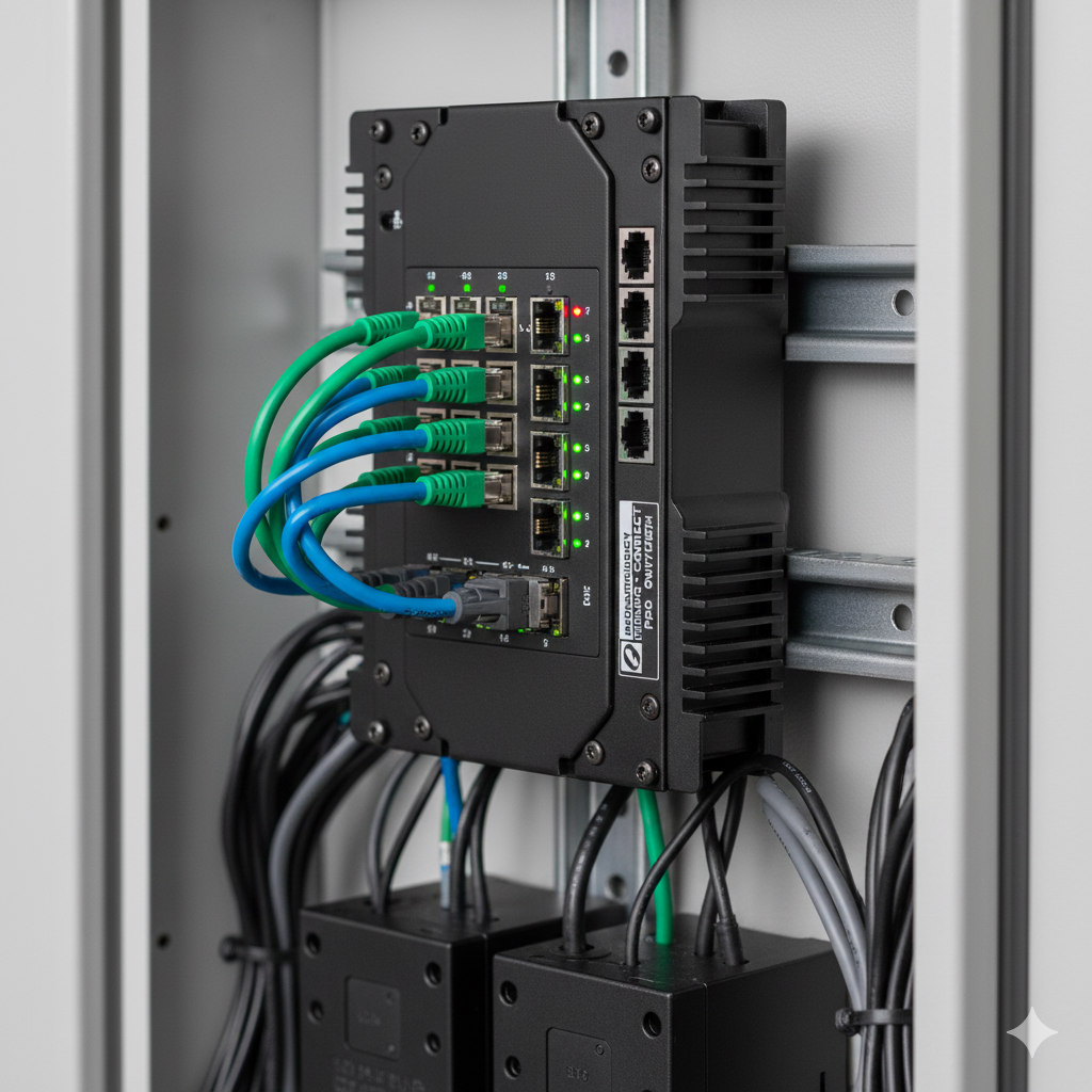 Industrial-grade networking hubs that manage data traffic across the factory floor, ensuring reliable communication between all Ethernet-enabled devices.